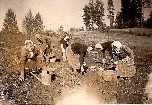 Kyläkuvia on kertynyt juhlasta ja arjesta, mutta lisää kaivataan eri aikakausilta nykypäivään saakka. Arjen aherrus oli 40-luvulla käsin tehtävä, kuten kuvassa perunan nostajat Kannisen pellolla.